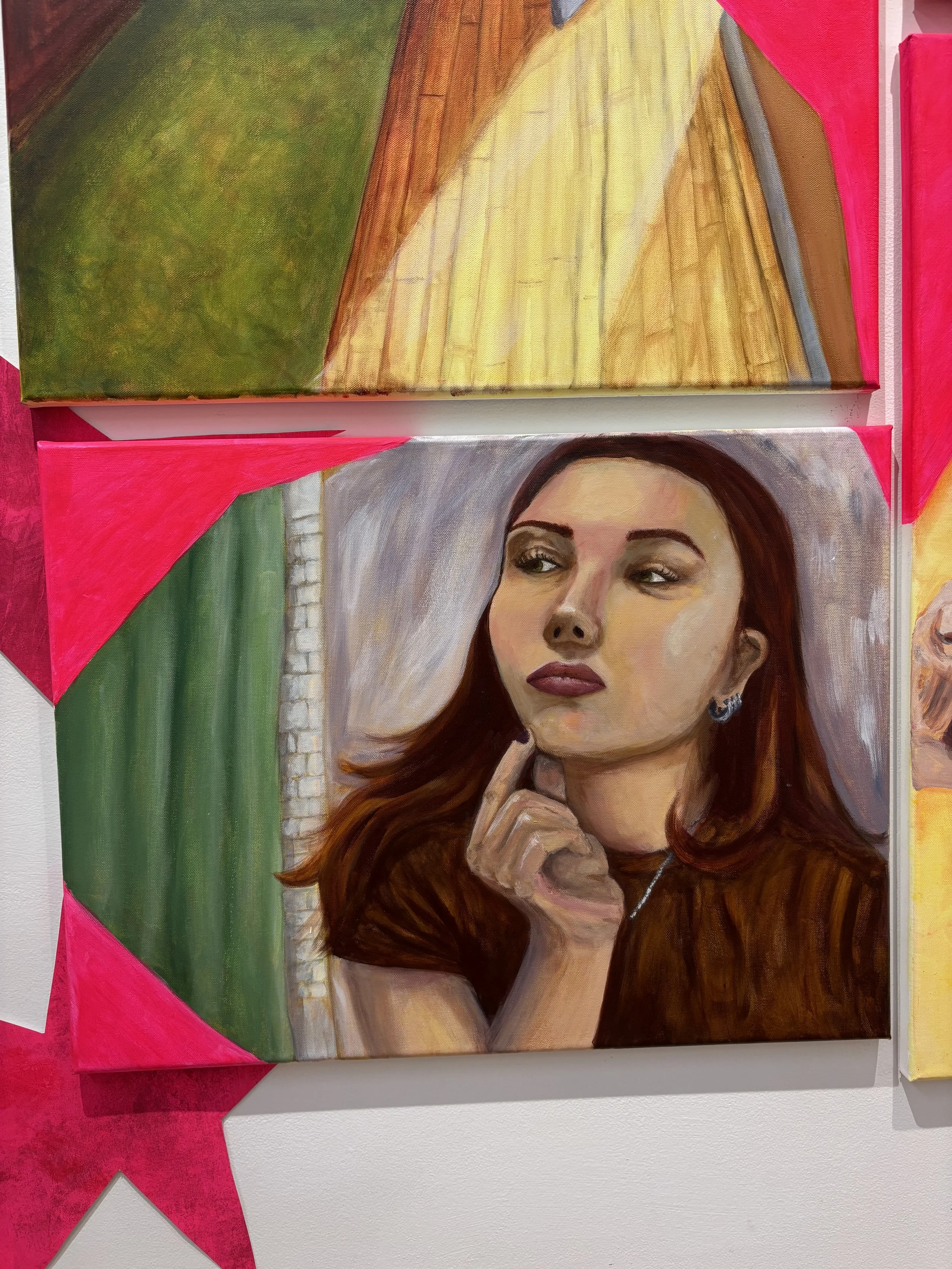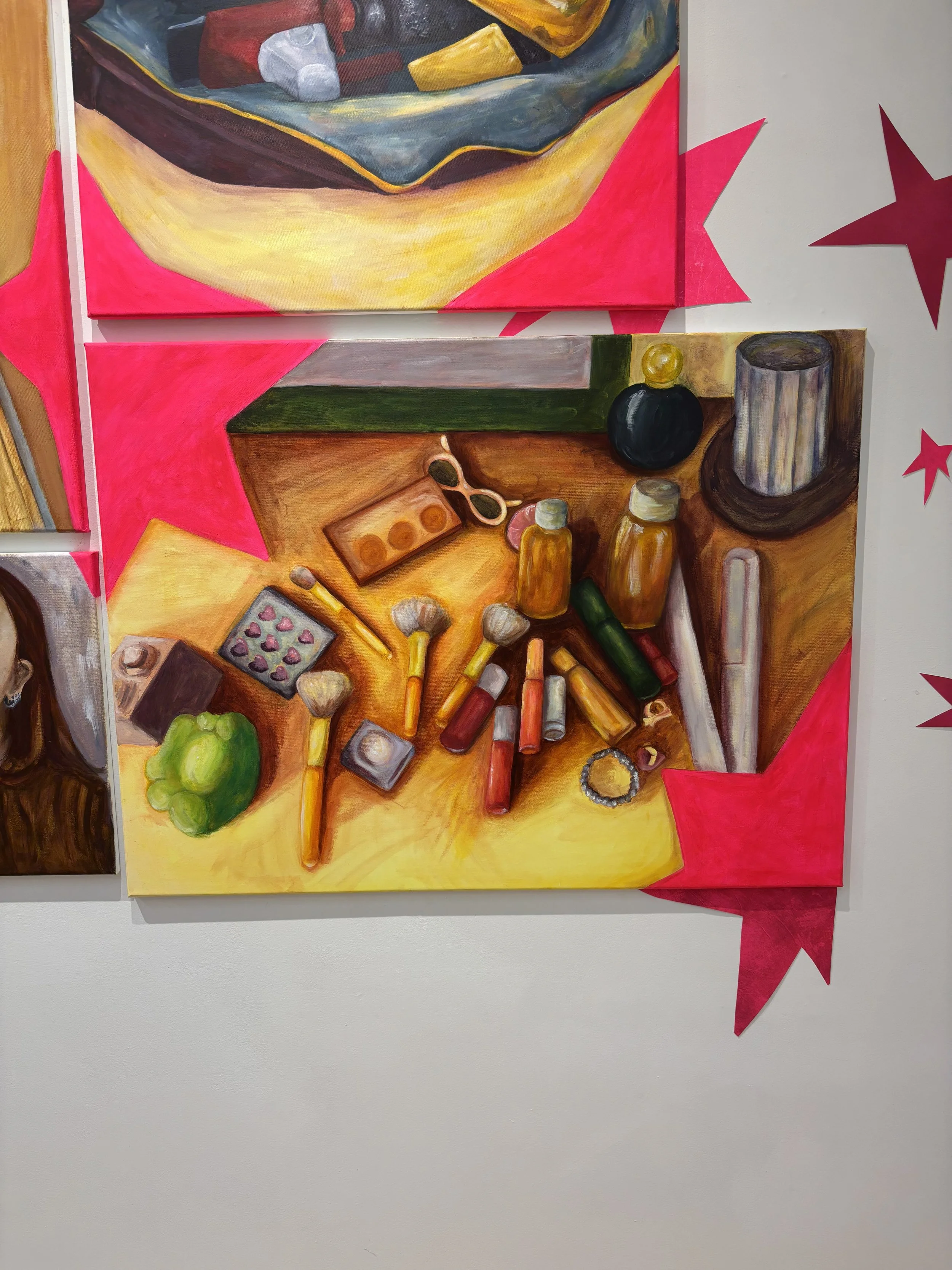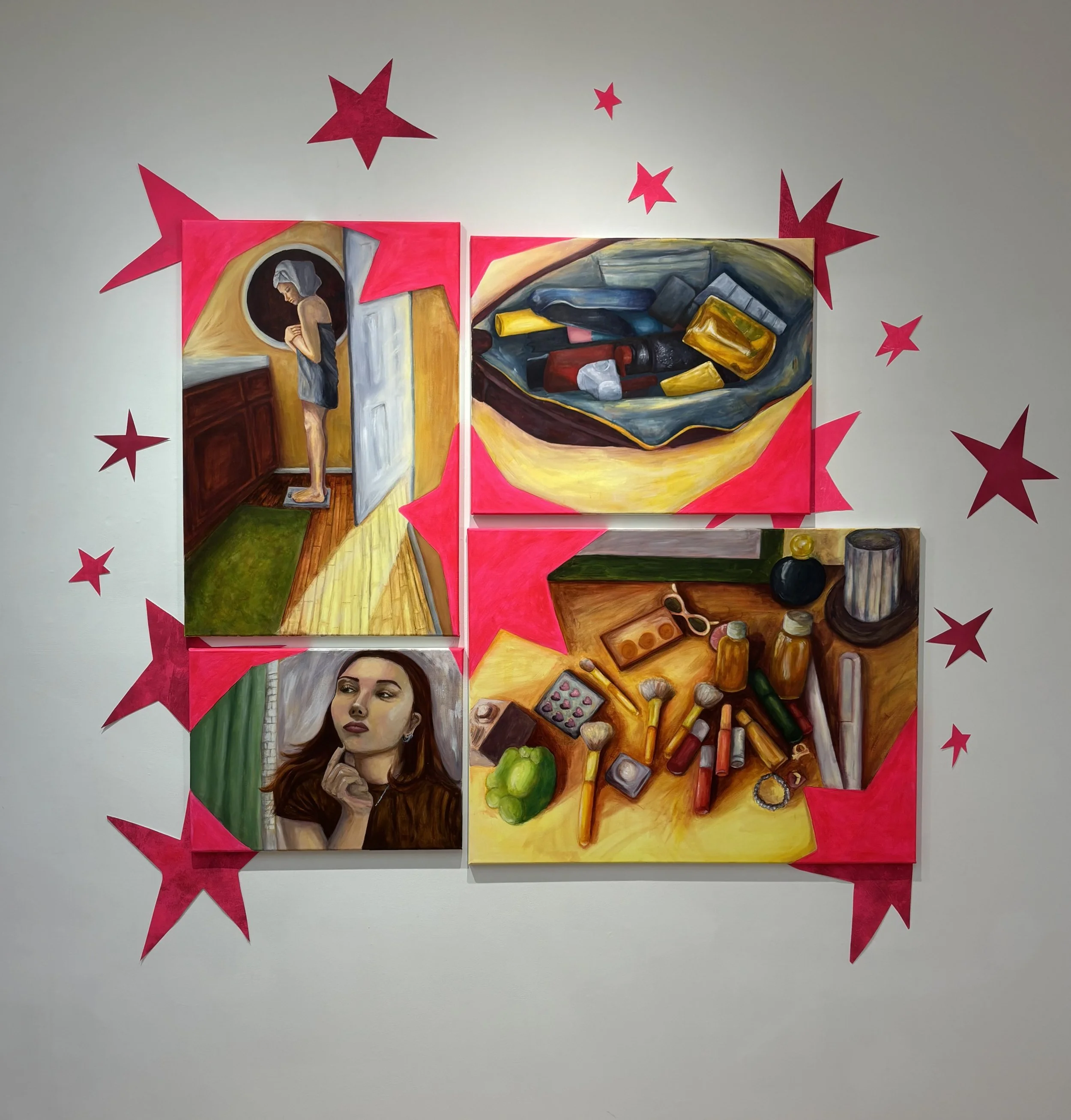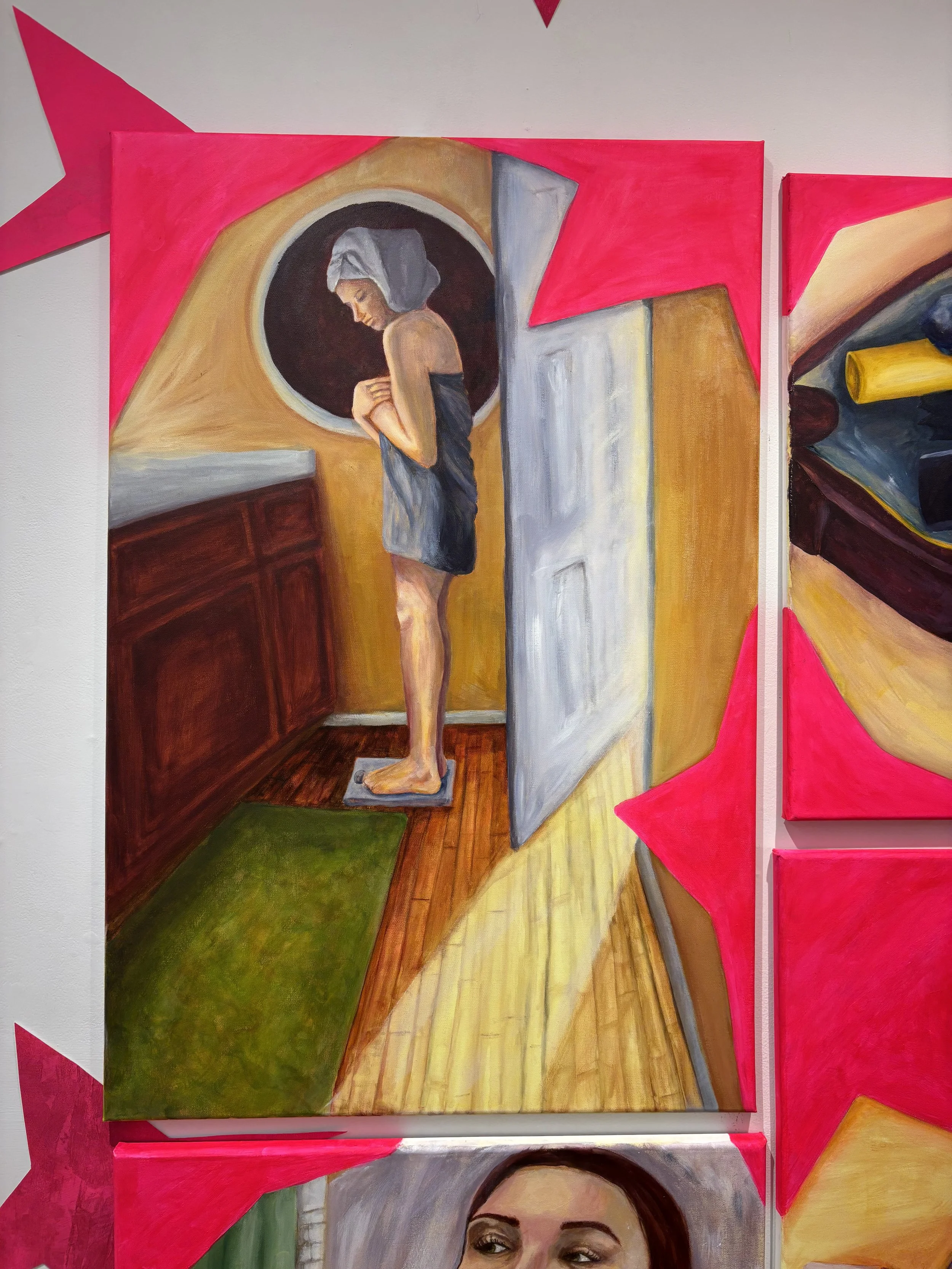 My work utilizes acrylic paint to create an atmosphere that embodies the teen girl world, such as makeup, stuffed animals, sparkly pepper spray, and a baby blue knife. These objects symbolize the shift from seeing the world as this bright and colorful place to one that we weren’t truly ever safe in. The portrait of a young girl standing on a scale and another staring at herself in a mirror explores themes of self perception and the beginning of body image issues.